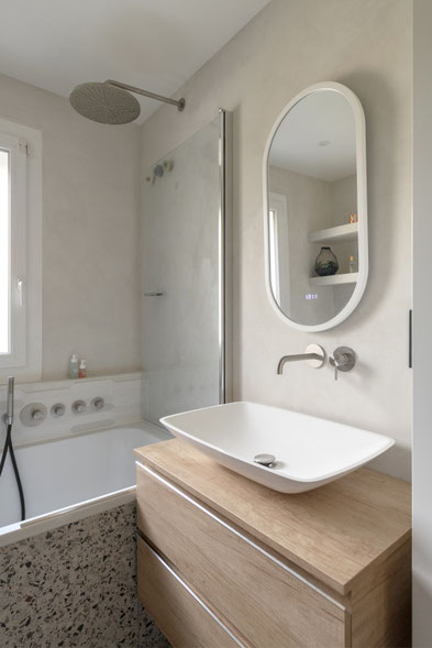 Le béton ciré se distingue par sa grande polyvalence. Appliqué au sol, il offre un rendu épuré et homogène. Sur les murs ou dans la douche, il remplace avantageusement le carrelage traditionnel et ses joints, souvent difficiles à entretenir. Il peut également habiller un plan vasque, une baignoire ou même un meuble, créant une salle de bain au caractère unique. Disponible dans une large palette de couleurs – du gris minéral au beige sable en passant par des tons plus audacieux comme le vert ou le terracotta – il permet de personnaliser son intérieur tout en restant intemporel.